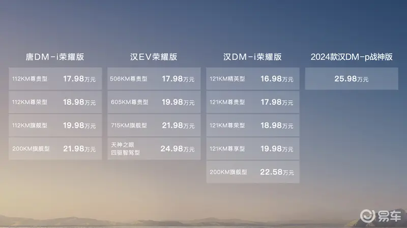 运油车转弯半径价来看从售,版共4款车型汉EV荣耀31方解放运油车,~24。98万元售价17。98;耀版共5款车型汉DM-i荣,~22。58万元售价16。98;p和神版共1款车型2024款汉DM-,。98万元售价25;耀版共4款车型唐DM-i荣,~21。98万元售价17。98。